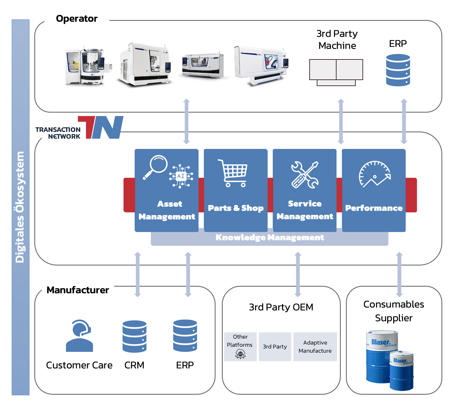 Transaction-Network verbindet Betreiber, Maschinenbauer, Drittanbieter und Lieferanten in einem gemeinsamen, digitalen Service-Ökosystem.