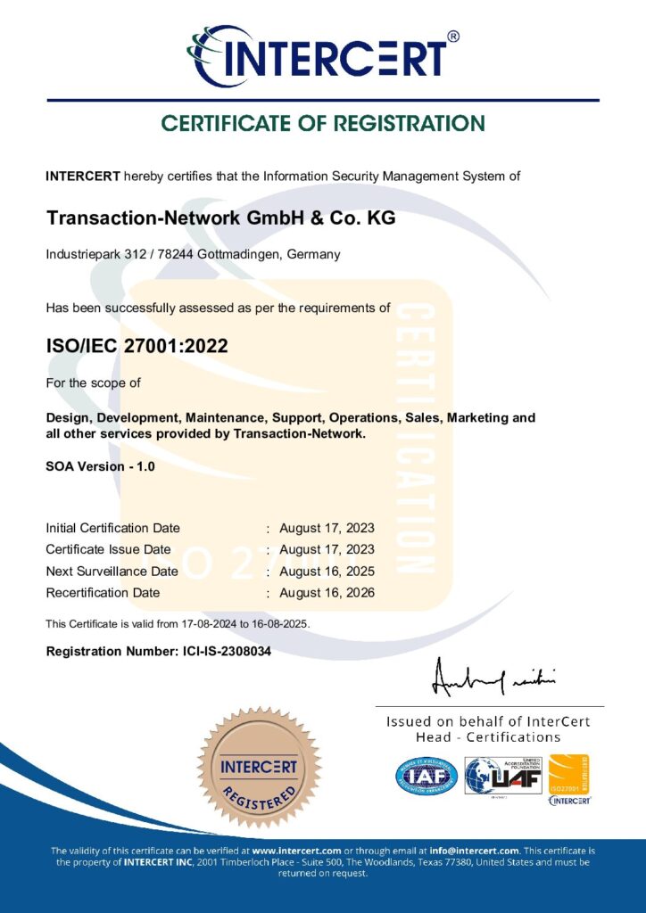Transaction-Network ist nach ISO 27001 zertifiziert — dem international anerkannten Standard für Informationssicherheits-Managementsysteme (ISMS).